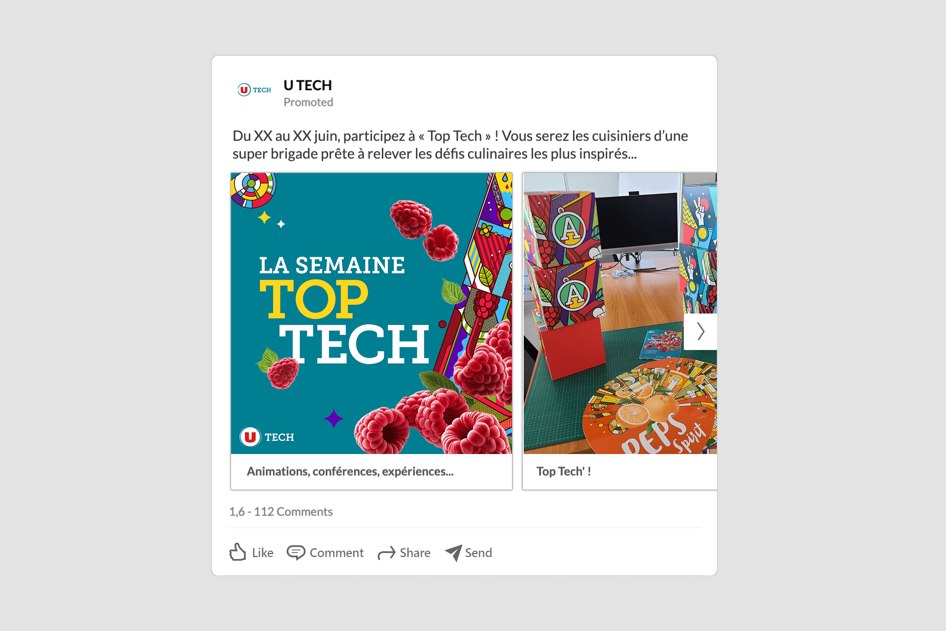 « Top Tech » (en rèf. à Top Chef bien évidemment), c’est l’art de relier transformation technologique et univers quotidien des collaborateurs via une métaphore puissante : celle de la recette réussie. Chaque chantier du plan devient un ingrédient clé, chaque collaborateur un cuisinier engagé, et l’écosystème U, le secret de l’inspiration collective. L’univers agroalimentaire, familier et chaleureux, a permis de créer une identité visuelle ultra fédératrice, généreuse, gourmande, pleine de peps et d’humour. Une communication qui fait sourire… et adhérer.