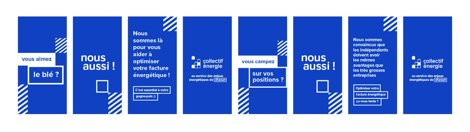 Une campagne globale pour revaloriser la communauté Collectif Énergies auprès des PME. Et, en parallèle, du micro-ciblage malin pour toucher chaque secteur avec ses codes : « Vous aimez le blé ? » pour les boulangers, « Vous campez sur vos positions ? » pour les campings…