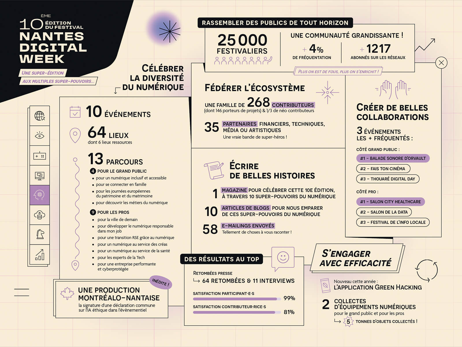 Pour ses 10 ans, le festival a mis les super-pouvoirs du numérique à l’honneur : accessibilité, créativité, découverte, inclusion… Une campagne participative a invité chacun·e à partager ses souvenirs, ses déclics, ses moments forts. L’occasion de célébrer une décennie de numérique à taille humaine et de projeter les dix prochaines avec enthousiasme.