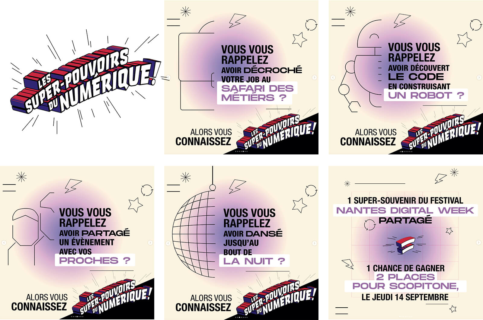 Faire de Nantes Digital Week le festival du numérique pour tous. Un positionnement clair, accessible, ouvert, pour refléter la diversité des sujets, des formats… et des gens. Puis construire une stratégie de contenus multicanal, pensée pour donner à voir toutes les facettes du numérique, sans jargon ni barrière.